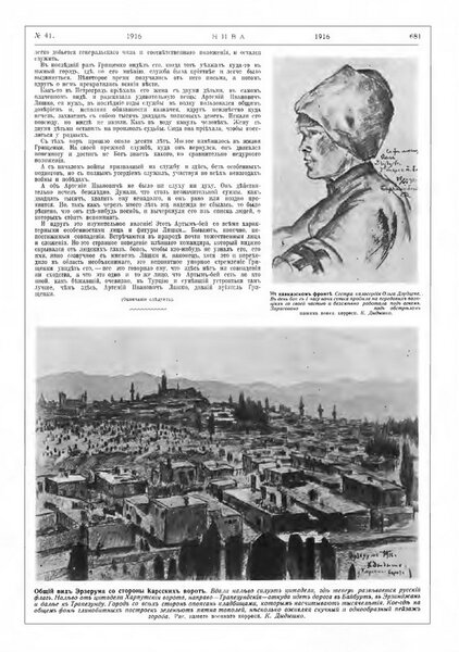 К. Стабровский. Шествие грозы (№5, с.73); Г. Георгиев. Партизаны (№6, с.90); М.Я. Кац. Слепой Самсон (№6, с.102); А.П. Мочалов. Рыболовы (№6, с.103); Г.К. Савицкий. Смерть Приама (Последний день Трои) (№6, с.103); С. Девяткин. Венец страдания – венец победы (№10, с.163); А. Семёнов. Из альбома участника войны (№11, с.181); В. Берингер. Битва (№12, с.197). Св. Георгий Победоносец (№41, с.689); В. Спасский. Илл. к рассказу И. Островного «Тарантул» (№15, с.257, 258, 259); П. Бучкин. Илл. к рассказу И. Потапенко «Наказание» (№15, с.264, 265, 266). Илл. к рассказу С. Бельского «Лаборатория великих разрушений» (№24, с.406, 407, 410, 414; №25, с.426, 427); С. Колесников. К заутрене (№15, с.268). Разведчик (№20, с.354). Беженцы (№44, с.733); Н. Подбереский. В разорённой Польше (№21, с.371); И. Порфиров. Смертный бой. Русь Святая и враг лютый (№23, с.397); Н. Самокиш. На пути к Эрзеруму (№24, с.405); Л.Р. Сологуб. Из походного альбома (№26, с.437, 439, 440); М. Греков. Тяжёлый момент (№32, с.533). Из боя (с.544). С продовольствием на позиции (№40, с.669); К. Дыдышко. На кавказском фронте (№41, с.679, 680, 681). Генерал-квартирмейстер штаба георгиевский кавалер П.А Томилов. Начальник снабжения армии оружием генерал-майор М.М. Карнаухов (№42, с.702). Пленный аскер. Подп. Виталий Ефимов (с.703); М. Авилов. На разведке (№44, с.725); М. Безродный. Разъезд (№44, с.736); Э. Липгарт. Покровители Франции (Les patrons de la France). Картина-образ, подаренная католической церкви Notre Dame de France в Петрограде (№47, с.773); В.И.[?] Зверев. Перед атакой (№47, с.781); Р. Берггольц. Эпилог. Замок меченосцев в Эстляндии (№49, с.806); И.Е. Репин. Портрет М. Горького (№49, с.817); К.В. Лебедев. Кончина царя Фёдора Иоанновича (№50, с.821); С. Лодыгин. Илл. к рассказу В. Келера «Радость жизни» (№51, с.838, 839, 841, 842; №52, с.853, 855, 857); М. Далькевич. Посмертная выставка В.Д. Орловского (№52, с.858, 859, 860) // Нива. Пг., А.Ф. Маркс, 1916