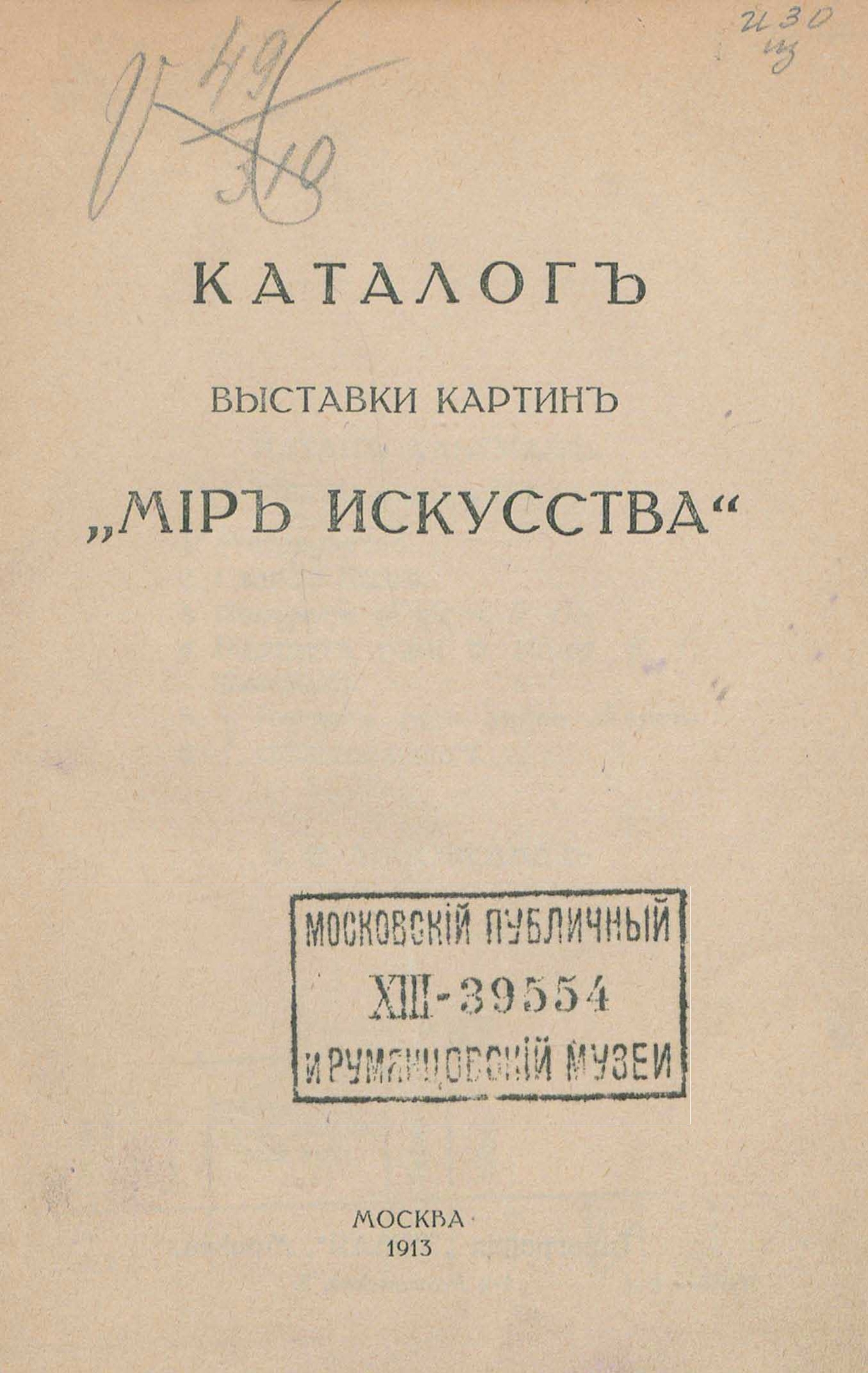 Каталог выставки картин «Мир Искусства» : [3–28 Ноября 1913 ; СПб., Морская, 38 ; 432№№]. – СПб. ; Худож.-Графич. Ателье и Печатня М. Пивоварский и А. [sic!] Типограф (СПб., Моховая, 8), 1913. – Изд.1. – Обл., тит.