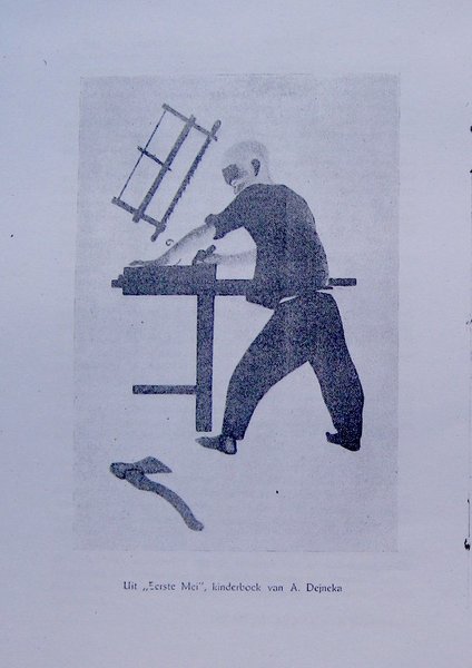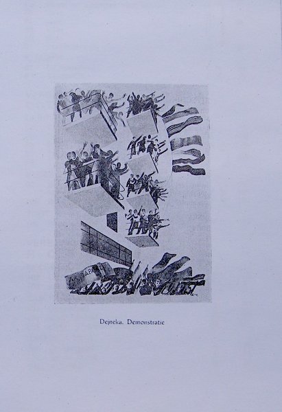 Grafiek en Boekkunst uit de Sovjet-Unie. Tentoonstelling Stedelijk Museum. Amsterdam, 21.4 – 13.5.[19]29. [Amsterdam], Genootschap Nederland Nieuwrusland (Boekomslag, Ill.: A. Dejneka. Uit «Eerste Mei», kinderboek; Demonstratie; Ssolowejtschik. Uit het album «Revolutiejaren»; J. Pimenoff. Teekening; W. Lebedew. Uit «Ijswafels», kinderboek)