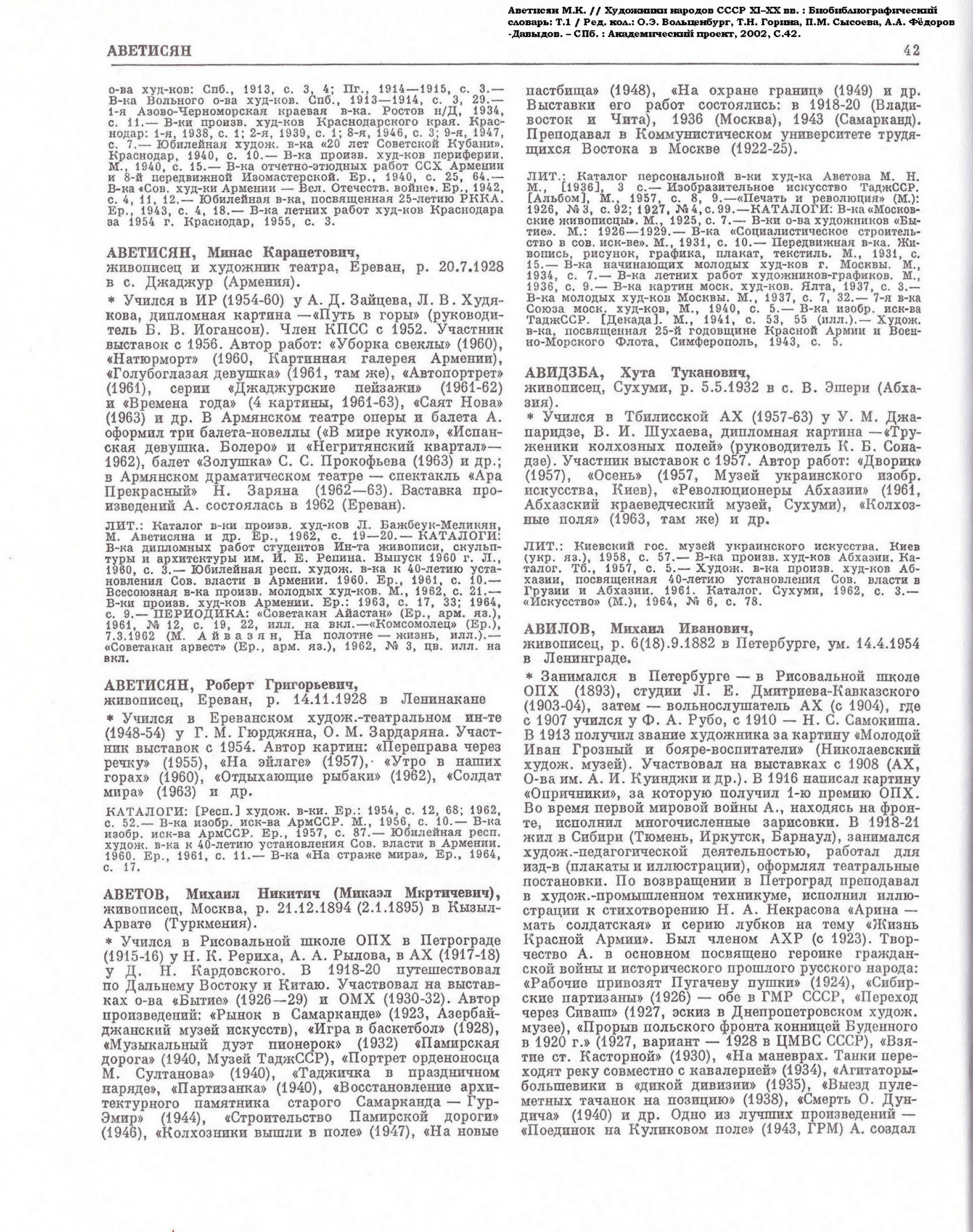 Аветисян М.К. // Художники народов СССР XI–XX вв. : Биобиблиографический словарь : Т.1 / Ред. кол.: О.Э. Вольценбург, Т.Н. Горина, П.М. Сысоева, А.А. Фёдоров-Давыдов. – СПб. : Академический проект, 2002, С.42. – Обл., контртит.-тит.