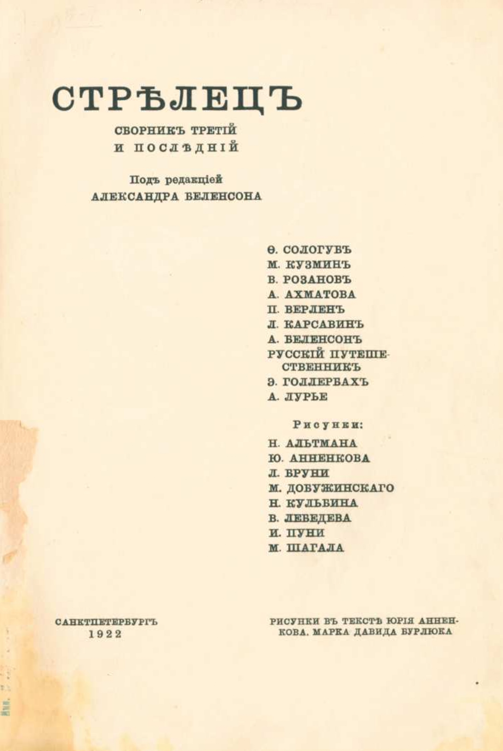 Стрелец : Сборник третий и последний / Ред.: А. Беленсон; рис. в тексте: Ю. Анненков; марка: Д. Бурлюк. – СПб. [Пг.] ; Первая Госуд. Тип. (СПб. [Пг.], Гатчинская, 26), 1922. – 300 экз. – Обл., тит.