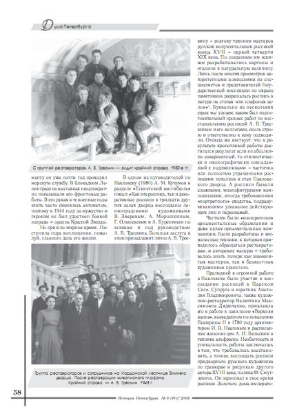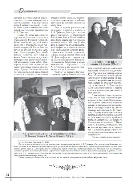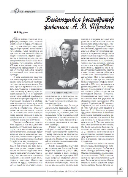 Yu. Mudrov. Anatoly Treskin - Outstanding Restorer of Painting // History of Petersburg. Issue 6(16). St Petersburg, 2003, p.57 – 62