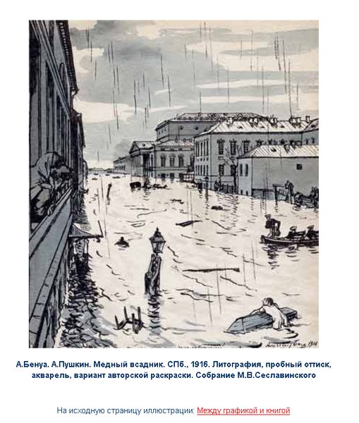 А. Бенуа. Иллюстрация к поэме А.С. Пушкина «Медный всадник». СПб., 1916. Литография, пробный оттиск, акварель, вариант авторской раскраски. Собрание М.В. Сеславинского // Наше Наследие. – М., 2008. – Вып.85.