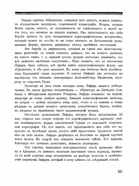 Mikhail Larionoff. S.M. Lifar // Tchisla. Issue 5. Paris, 1931, p.220 – 221