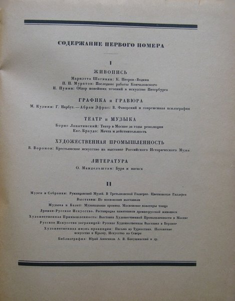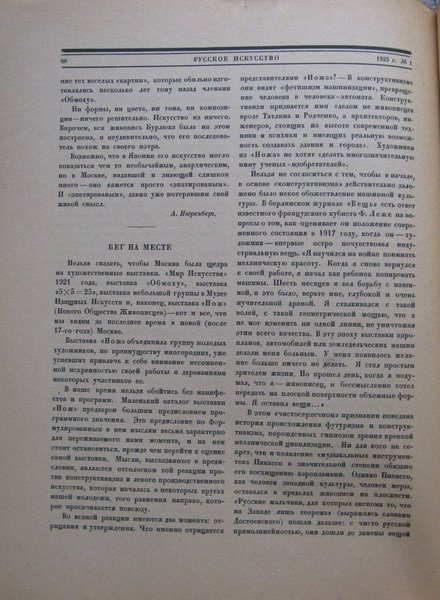 А. Нюренберг. По московским выставкам // С. Абрамов (ред.). Русское Искусство. Вып.1. М.-Пб. [Пг.], Творчество; Государственный Трест «Петропечать», Тип. им. Ив. Фёдорова [б. Голике и Вильборг. Петроград], Звенигородская, 11; 3 000 экз., 1923, с.87 - 88 (Шрифт на обл.: С. Чехонин, Марка изд.: Л. Бакст)